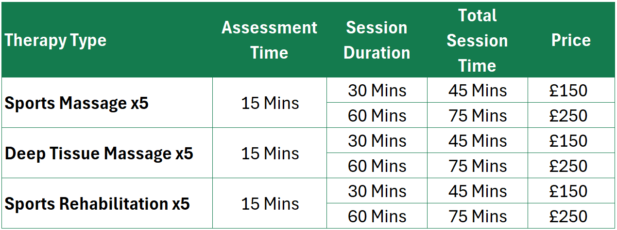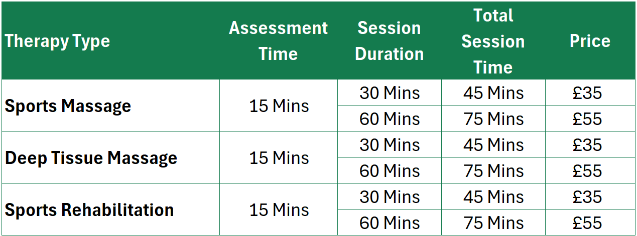 Please note that both blocks include 15 mins for your consultation and assessment, which is included in the price. This means that a 30 min massage session will have a duration of 45 mins, and a 1 hour session will have a duration of 1 hour 15 mins - We are just letting you know to help you manage your time!